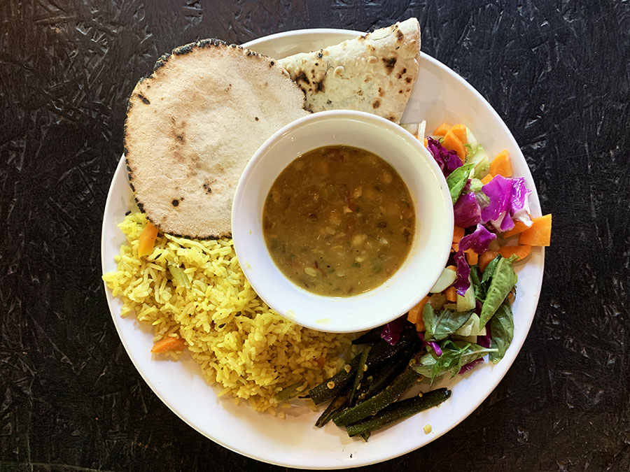 Másnap a reggelire érkeztünk. Kedvesek voltak. Mondták, hogy pakoljuk le a táskáinkat, fogyasszunk kedvünkre, a regisztráció megvár. A 10 órakor kezdődő reggeli itt az ebéd is egyben, a breakfast (reggeli) és a lunch (ebéd) szavak játékos keresztezéséből brunch-nak nevezik. A valódi reggelit pedig inkább hajnalinak kéne hívni, 6:45-kor tálalják a gyümölcstálat és a gyógyteát. Finoman, választékosan és bőségesen főznek. Az ételek szattvikusak, azaz pépesek, könnyen emészthetőek, nem olajosak, kevésbé fűszeresek, mint az indiai éttermekben általában.