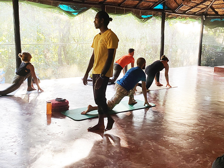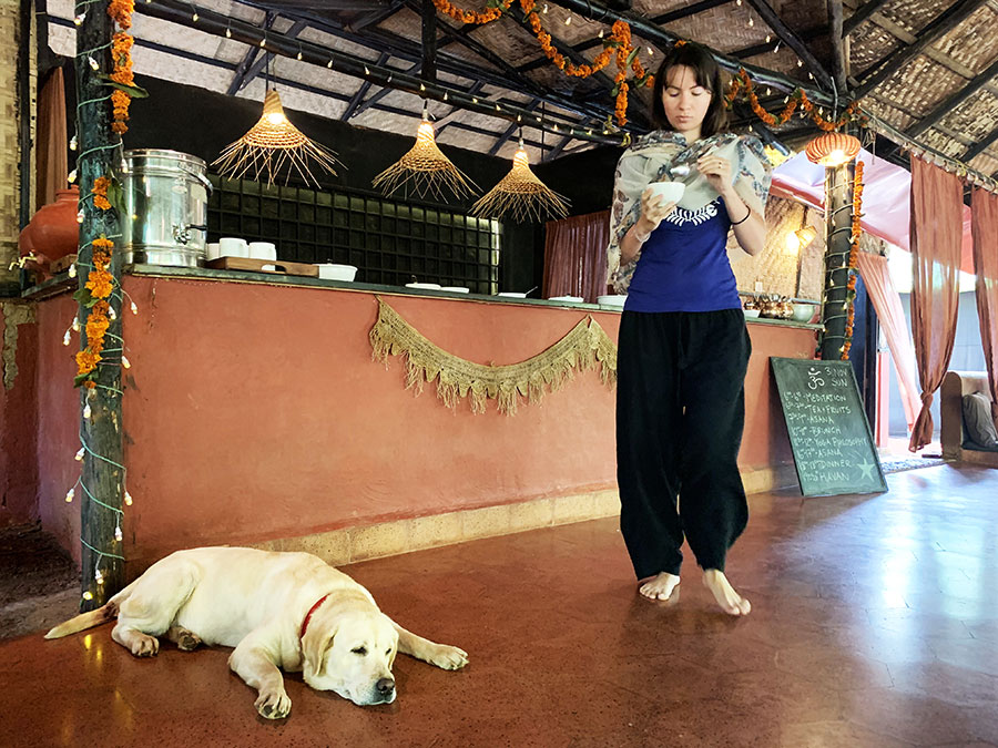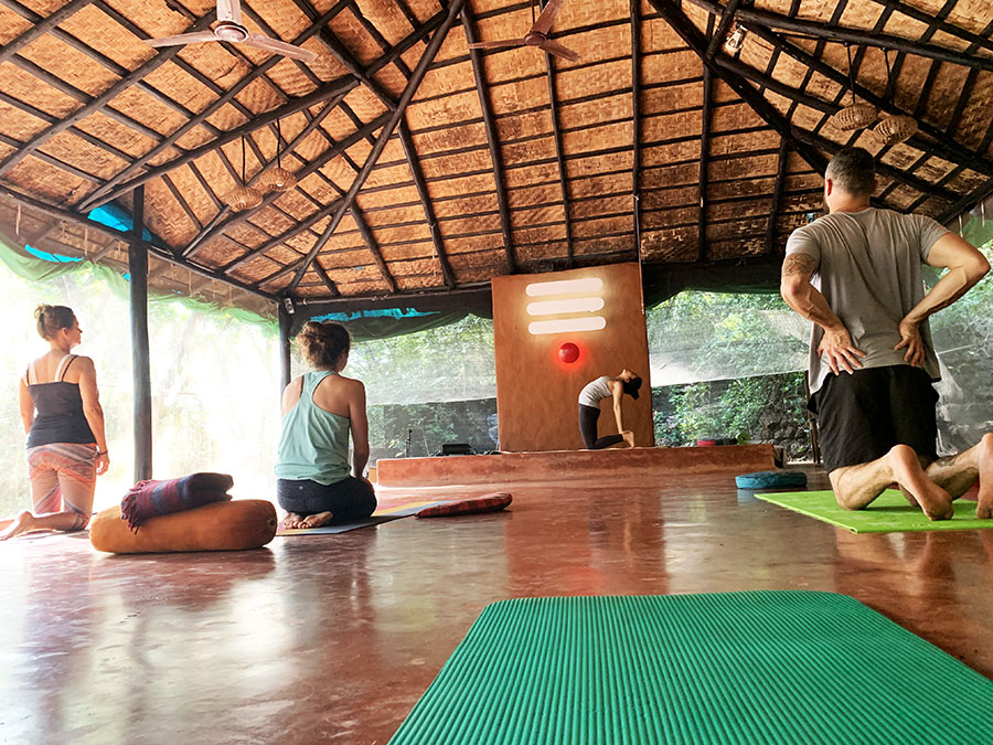 A jóga központban barátságosan fogadtak. Illedelmesen megkérdezték, mi járatban vagyunk. Előre felhívták a figyelmünket arra, hogy ha csak tornázni vagy nyújtani szeretnénk, rossz helyen járunk, mert ők nem a jóga kommercionalizált változatát követik, hanem az Ashtanga yoga hagyomány gyökereit, tehát a központ ashram-szerű rendszerben működik. Ezzel nem le, sokkal inkább rábeszéltek. Mi épp egy ehhez hasonló autentikus élményre vágytunk, illetve arra, hogy elvonuljunk a tengerpart és a civilizáció zajától, kipihenjük magunkat, és lelassuljunk (ekkor már több mint egy hónapja folyamatosan úton voltunk, Nepálból indultunk). Kacie, egy amerikai karma jógi, aki egy éve érkezett Indiába, és önkéntesként járja a jóga központokat és ashramokat, hogy tanuljon, majd New Yorkban taníthassa a jógát, körbevezetett, hogy válasszuk ki a nekünk megfelelő szállást. A legolcsóbb „budget” kunyhót választottuk, így 50 euróra jött ki fejenként a csomag, ami a szálláson túl napi háromszori étkezést is tartalmazott, illetve a legfontosabbat, a tanításokat. Ár-érték arányban a környékbeli iskolákhoz képest állítólag az egyik legkedvezőbb lehetőség. Két másikat is néztünk a neten, azok valóban drágábbak voltak.
