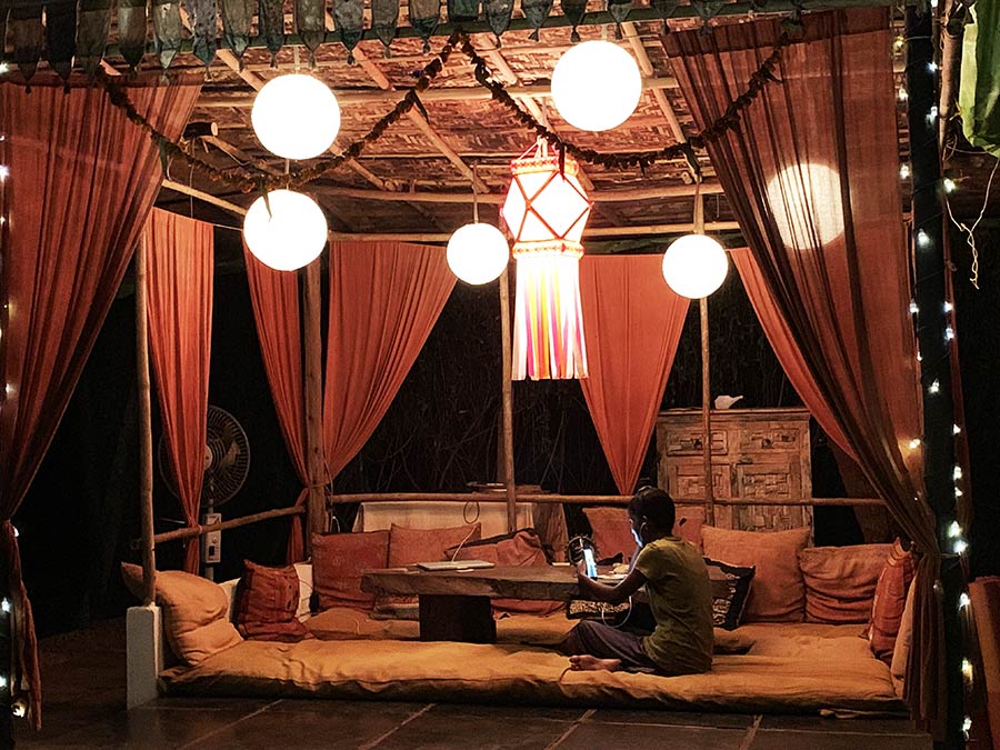 Érdemes pénteken érkezni egyébként, amikor nincs program. Van idő megérkezni, kipakolni, körülnézni. Mi a programok sűrűjébe érkeztünk szombaton. Ha valaki jógaszőnyeggel utazik külföldre jóga elvonulásra, ajánlott vékony és könnyű utazós (travel) jóga matracot választani. Nálunk sajnos nem volt, de szerencsére itt tudtunk napi 100 rúpiáért kölcsönözni.