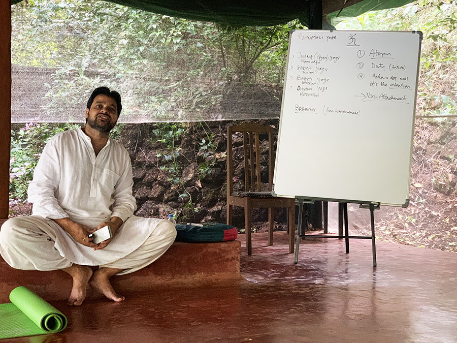 Az oktató sokat idézett a Bhagavad Gita történeteiből, erősen ajánlotta tanulmányozni. A benne foglalt tanítások és bölcsességek szerinte a mai kor problémáira is választ adnak, holott a könyv az időszámításunk előtt íródott. Hangsúlyozta, hogy minden ember születésénél egy dolog azonos és bizonyos: egyszer meghal. Szenvedés lesz a születés, a halál és a kettő között is sokszor fog fájdalmat érezni és lesz szomorú. Az elméje csapong, mint a tenger hullámai, miközben az ideális állapot a tengerfenék csendjének és nyugalmának elérése lenne, amiben a yoga egyik központi eleme, a meditáció tud segíteni. A cél az elmének, ennek az ide-oda ugráló ittas majomnak a megszelídítése, valódi kiegyensúlyozott isteni természetünk (Atman) megtalálása, ami örökkévaló és elpusztíthatatlan. Csak az Atman ruhája, a test semmisül meg, az Atman maga újjászületik, amíg az ember meg nem világosodik. Spirituálisan a yoga végső célja az egységélmény megtapasztalása, maga a kifejezés is a yuj, (össze)kötés szóból származik.