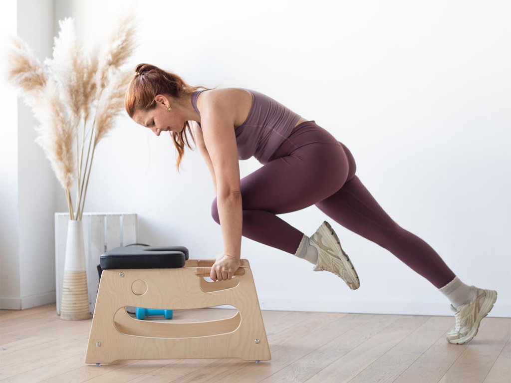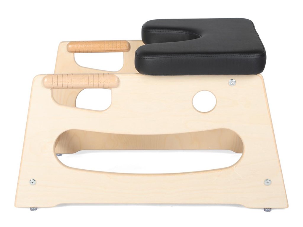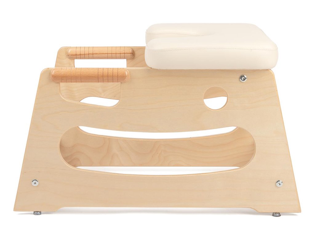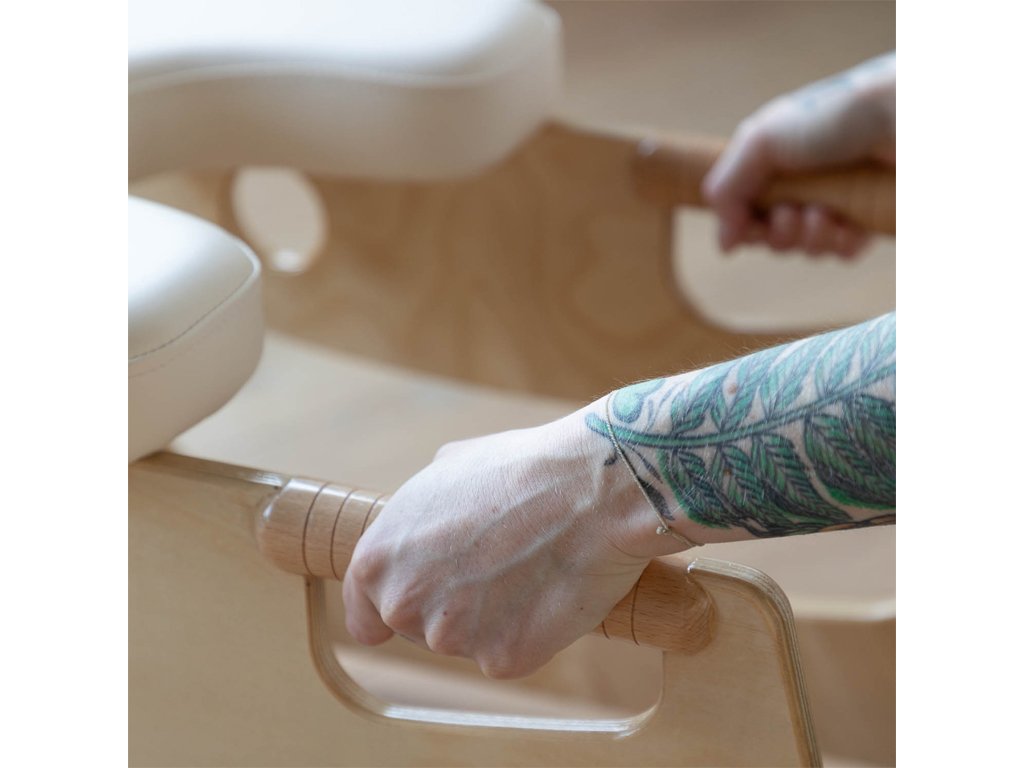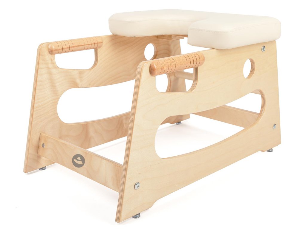 A beépített fa fogantyúk biztos, természetes fogást nyújtanak a fejenállásba való belépésnél és az egyensúly megtartásánál. Ez növeli a biztonságérzetet, és támogatja az erő, a stabilitás és a koordináció fejlődését. A csúszásgátló talpak gondoskodnak róla, hogy a szék edzés közben stabilan a helyén maradjon.