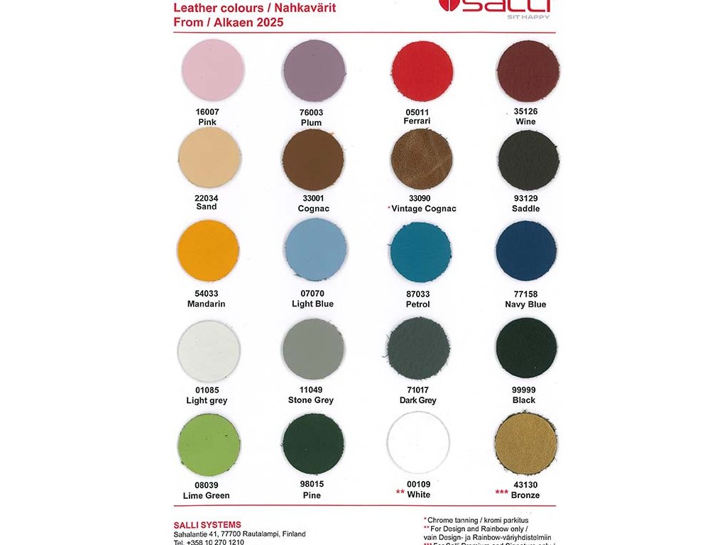 A Salli Swing nyeregszéket különféle színekben (20x bőr, 7x szintetikus bőr, lásd a galériában található színskálát) és kétféle konstrukcióval (krómozott vagy fekete) forgalmazzuk. Most díjmentesen választhat egy speciális Salli talpazatot is, amely kellemes reflexmasszázst biztosít a fáradt lábak számára.