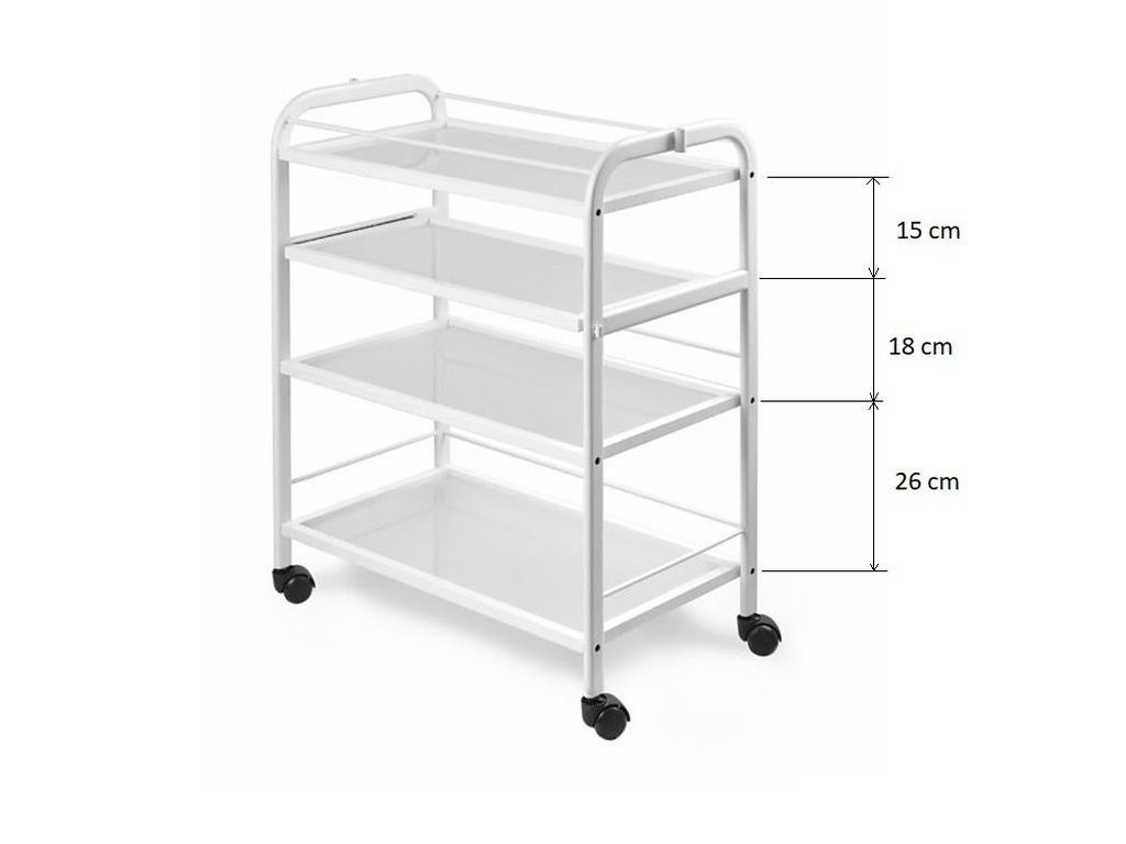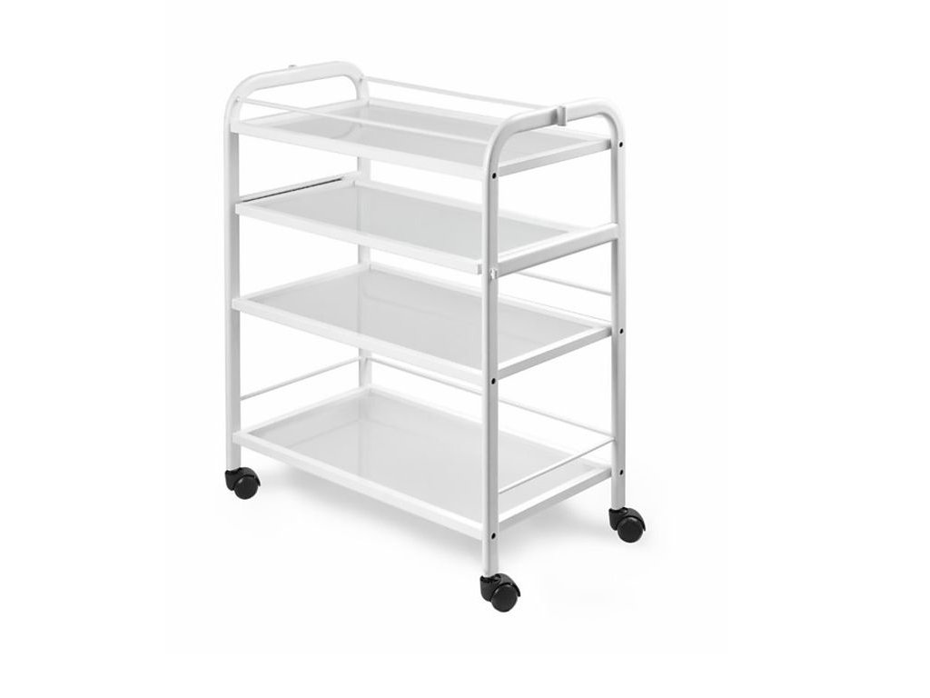A kozmetikai eszköztartó kocsi könnyen áthelyezhető a négy keréknek és a fogantyújának köszönhetően. Az eszköztartó kocsi négy polcának peremei megakadályozzák az állványon tárolt kozmetikai eszközök leesését. A kozmetikai kocsi második polca kihúzható.